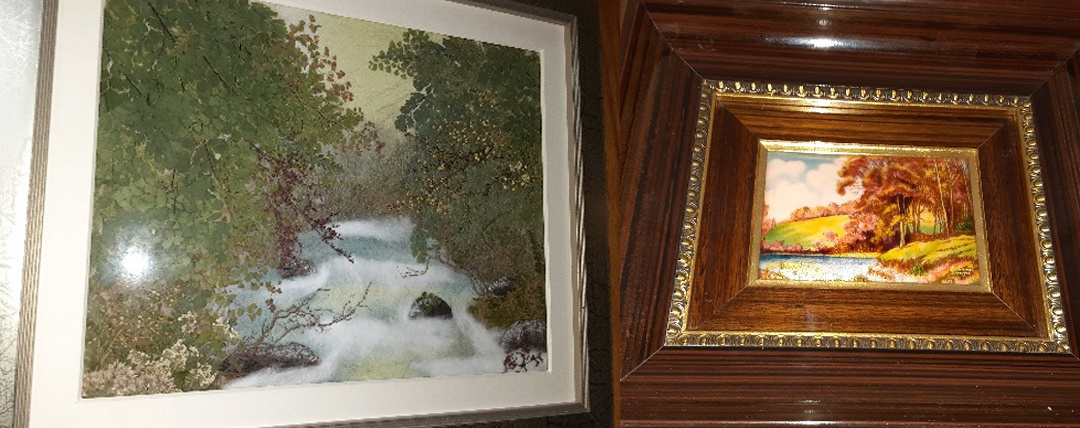 喫茶アールデコでは、室内の壁や家具の中段に装飾品を飾っています。