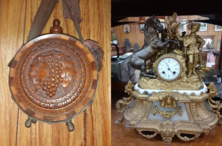 ↑ブドウの彫刻を施した水筒 ↑白い大理石に金属の装飾、馬と人物の彫刻を飾った置時計